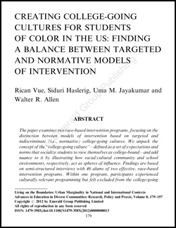 Vue, R., Haslerig, S., Allen, W.R., & Jayakumar, U.M. (2012). Creating college going cultures for Students of Color in the U.S.: Balancing cultural integrity and universal norms. In Living on the Boundaries: Urban Marginality in National and International Contexts (Ed. Yeakey, C. C.) Bristol, England: Emerald Inc.